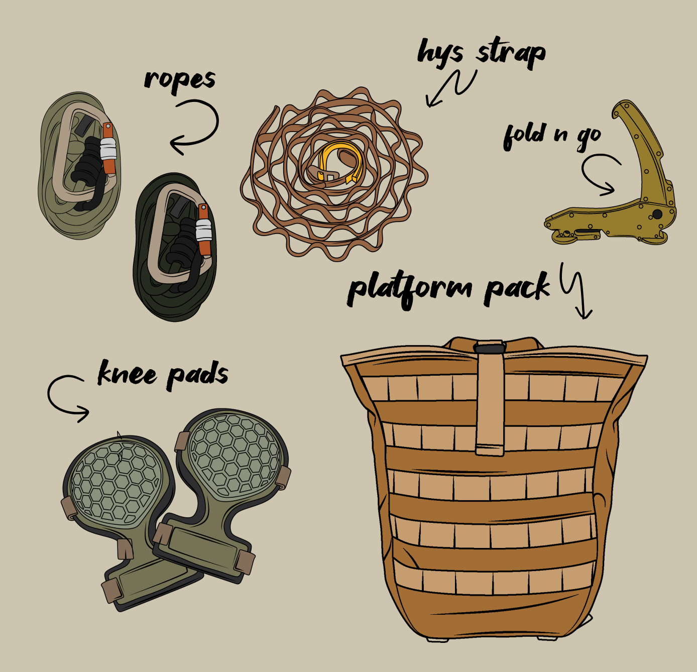 Just the basics. Each kit comes with a saddle, lineman belt, and tree tether. Add a platform and sticks, and you’ll be set.