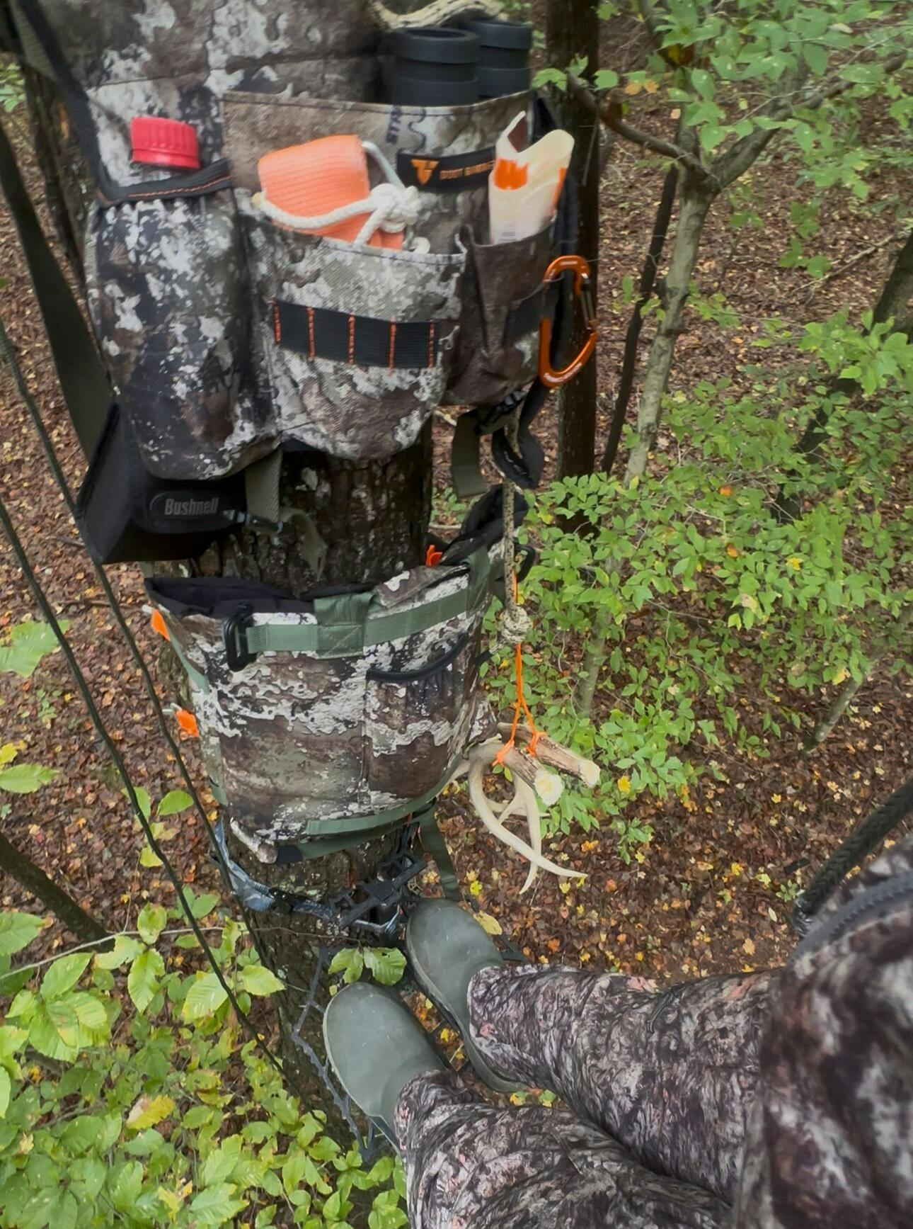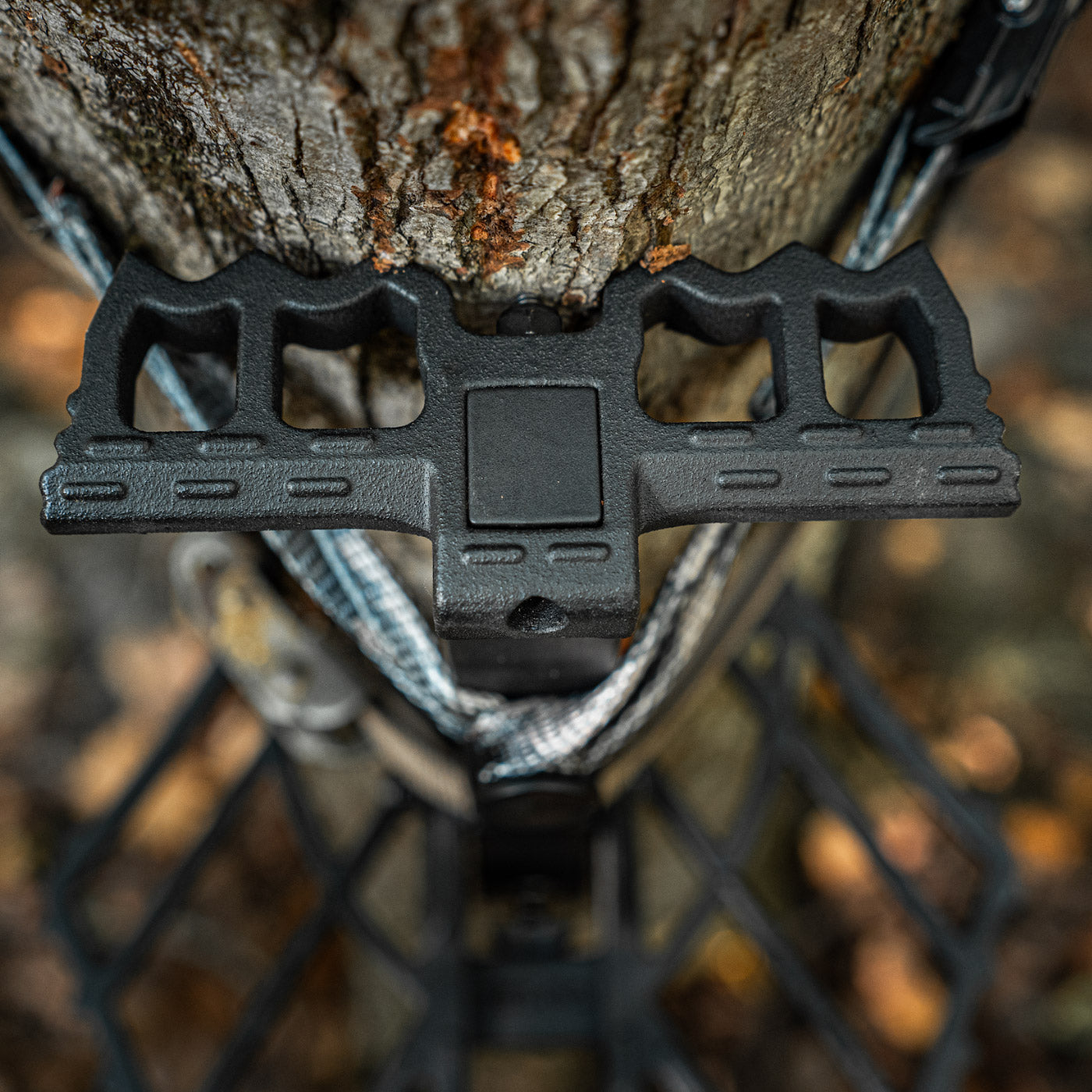 An aluminum MOLLE attachment hook has been added to the post, allowing you to effortlessly attach the platform to your saddle - resulting in hands-free climbing and easy access for deployment.