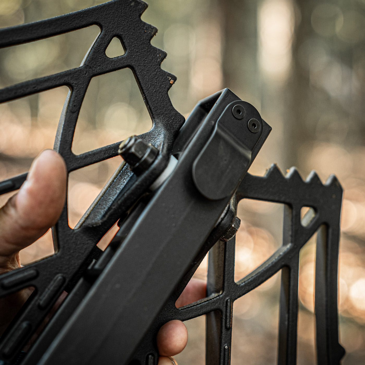 An aluminum MOLLE attachment hook has been added to the post, allowing you to effortlessly attach the platform to your saddle - resulting in hands-free climbing and easy access for deployment.