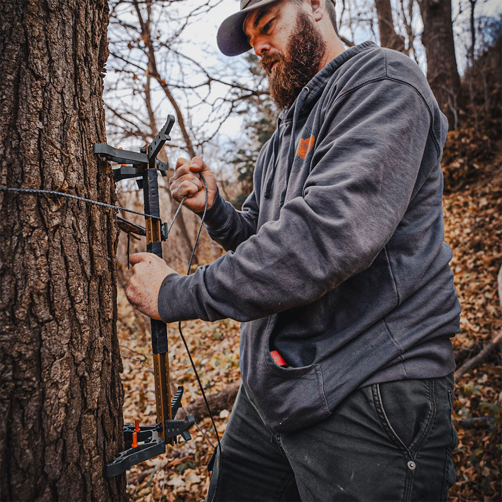 The Skeletors attach to the tree with our patented DynaLite rope and tab. It's the most user friendly, lightweight, simple, and fast connection method in history.