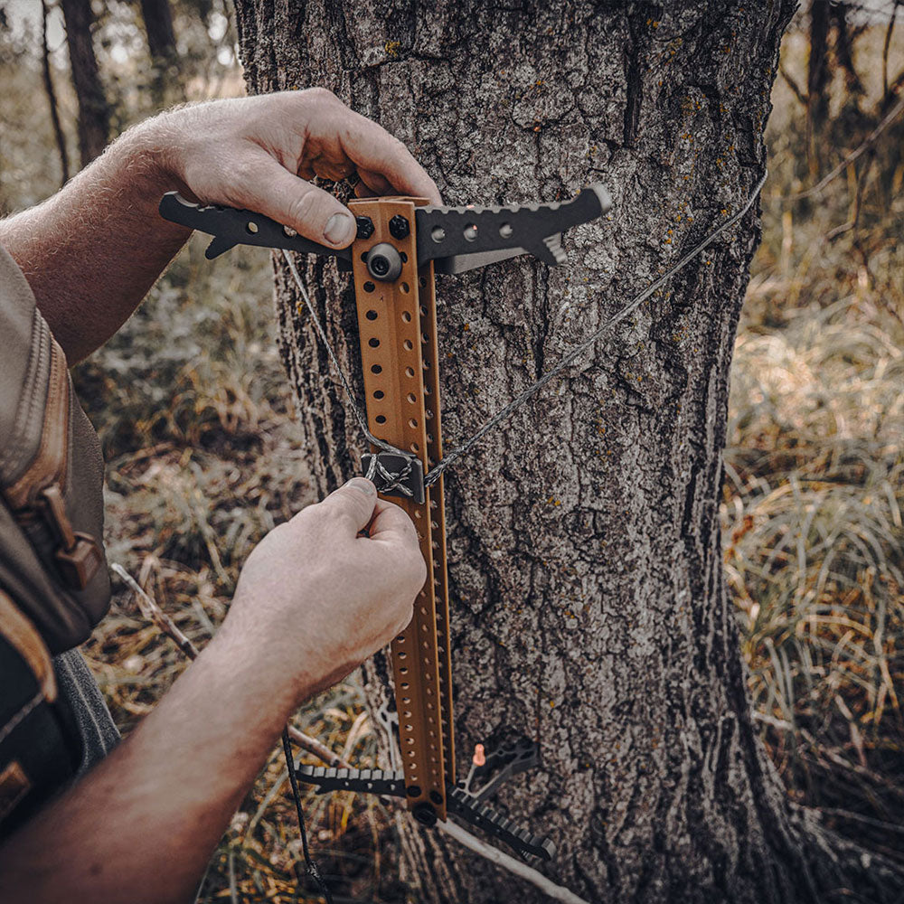 The Skeletors attach to the tree with our patented DynaLite rope and tab. It's the most user friendly, lightweight, simple, and fast connection method in history. There are no heavy buckles. There are no mechanical pieces. There is no fiddle factor.